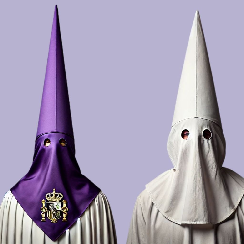 El capirote que oculta el rostro revela una fascinante paradoja entre una manifestación religiosa y una organización de odio separadas por un océano de diferencias.